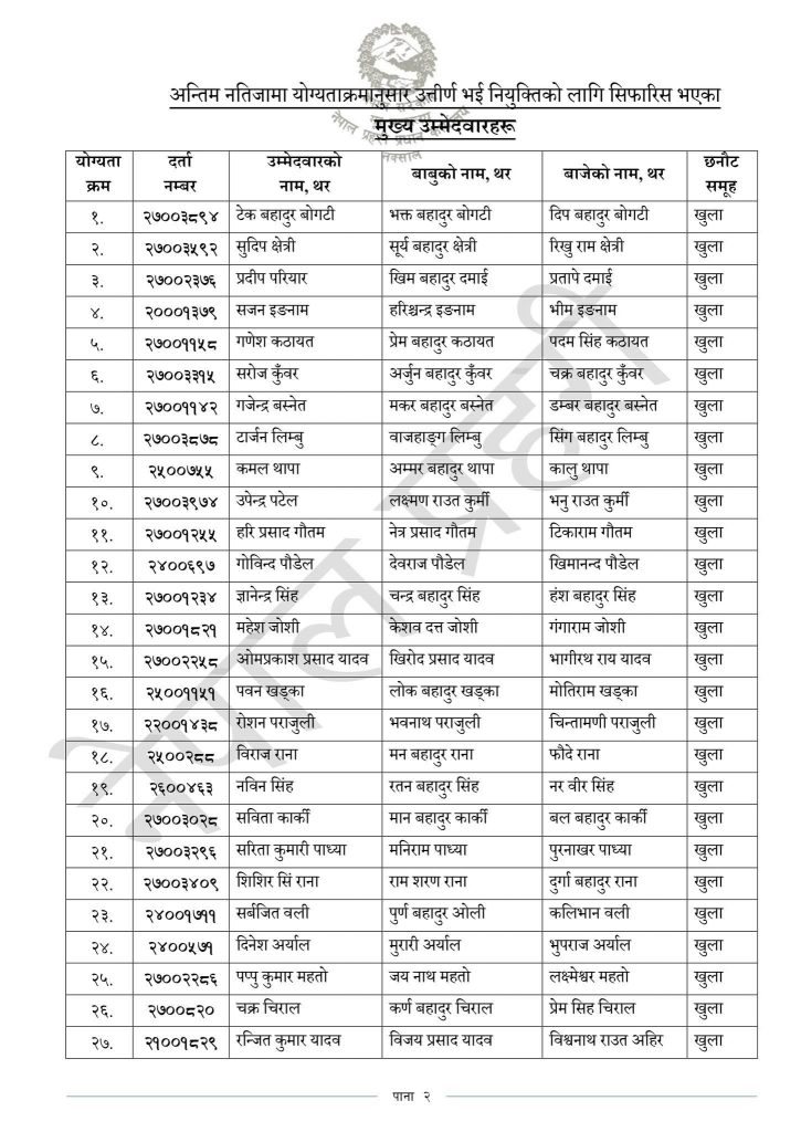 अन्तिम नतिजामा उत्तीर्ण भई नियुक्तिका लागि सिफारिस भएका ३१६ जना छन् । वैकल्पिक सूचीमा रहेको उमेदवारहरूको पनि नामावली प्रकाशन गरिएको छ ।