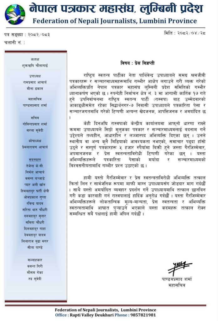 महासंघ लुम्बिनी प्रदेश समितिका महासचिव पाण्डवप्रसाद शर्माले विज्ञप्ती जारी गरेर रुपन्देही निर्वाचन क्षेत्र नं. ३ मा आगामी कार्तिक १७ गते हुने उपनिर्वाचनमा रास्वपाबाट उम्मेदवारको आकाङ्क्षी रहेका सिद्धार्थनगर–७ निवासी उपाध्यायले पत्रकारिता पेसा र सञ्चारमाध्यमलाई बदनाम गर्ने उद्देश्यले गैरजिम्मेवार टिप्पणी गरेको भन्दै गम्भीर आपत्ति जनाउनुभएको छ ।