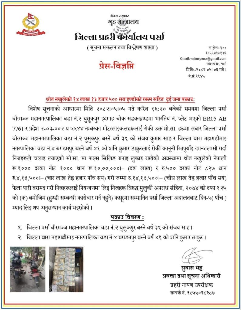 बिहीबार विशेष सूचनाका आधारमा पर्सा प्रहरीले छुटै टोली परिचालन गरी बीरगंजको इदगाह चौकबाट दुईवटा मोटरसाइकल चेकजाँच गर्दा साहले चलाएको मोटरसाइकलबाट १० लाख र ठाकुरले चलाएको मोटरसाइकलबाट ४ लाख १३ हजार ५ सय श्रोत खुल्न नसकेको रकम बरामद गरी दुवै जनालाई नियन्त्रणमा लिएको जिल्ला प्रहरी कार्यालय पर्साका प्रमुख गौतम मिश्राले बताए ।