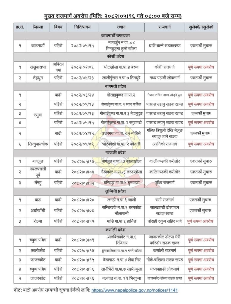 प्रहरीका अनुसार आज बिहानसम्म संखुवासभाको कोसी राजमार्ग, रसुवाको नेपाल–चीन जोड्ने पुल र पासाङल्हामु राजमार्ग, सिन्धुपाल्चोकको अरनिको राजमार्ग, रोल्पाको घोराही–रुकुम सहिद मार्ग, रुकुम पश्चिमको जाजरकोट–डोल्पा–भेरी सडक, कालीकोटको कर्णाली राजमार्ग, जाजरकोटको मोर्क–चंखिला सडक, रुकुम पश्चिमको मध्यपहाडी राजमार्ग र जाजरकोट–डोल्पा सडक पूर्ण रूपमा अवरुद्ध छन्।