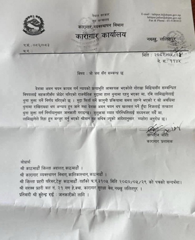 काठमाडौं । रास्वपाका सभापति तथा पूर्व गृह मन्त्री रवि लामिछानेले कारागारको पत्र सार्वजनिक गर्दै भने,”सबै कानुनी प्रक्रिया पूरा गरेर कारागारबाट रिहा भएको हुँ”
