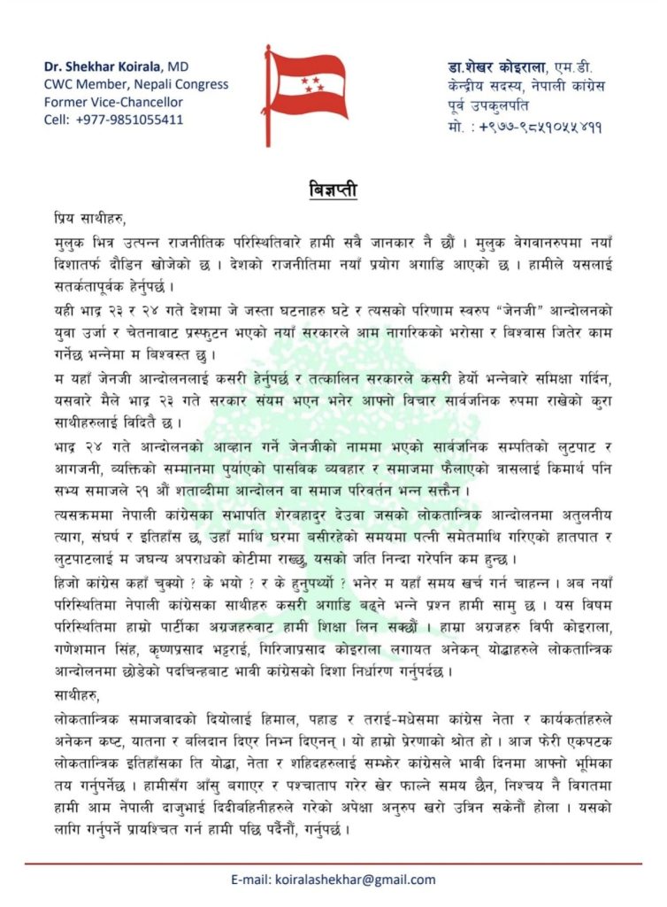 काठमाडौँ । नेपाली कांग्रेसका नेता डा. शेखर कोइरालाले पार्टी सभापति शेरबहादुर देउवा दम्पतिमाथिको आक्रमण जघन्य अपराध भएको बताएका छन्।