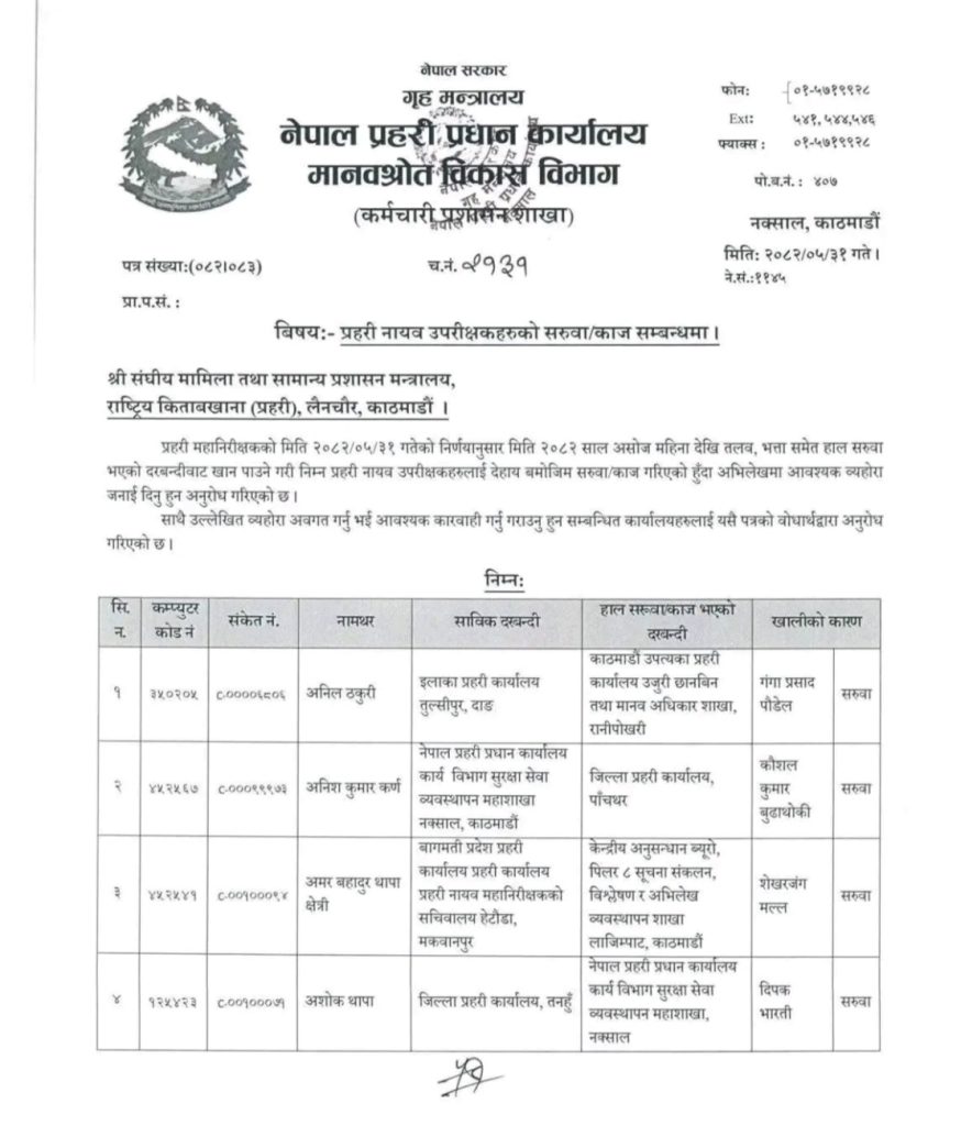 जिल्ला प्रहरी कार्यालय संखुवासभामा कुमार प्रसाद मैनाली, पाँचथरमा अनिश कर्ण, दार्चुलामा गौरव महत, प्यूठानमा नरहरी अधिकारी, अर्घाखाँचीमा दिवस जिसी, डडेल्धुरामा बरुण बहादुर सिंहको सरुवा भएको छ ।