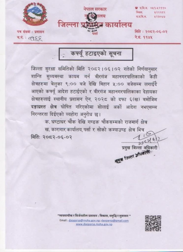 पर्सा । बिरगंज जिल्ला सुरक्षा समितिको निर्णयअनुसार वीरगञ्ज महानगरपालिकाका केही क्षेत्रमा लगाइएको कर्फ्यू आदेश हटाइएको छ।