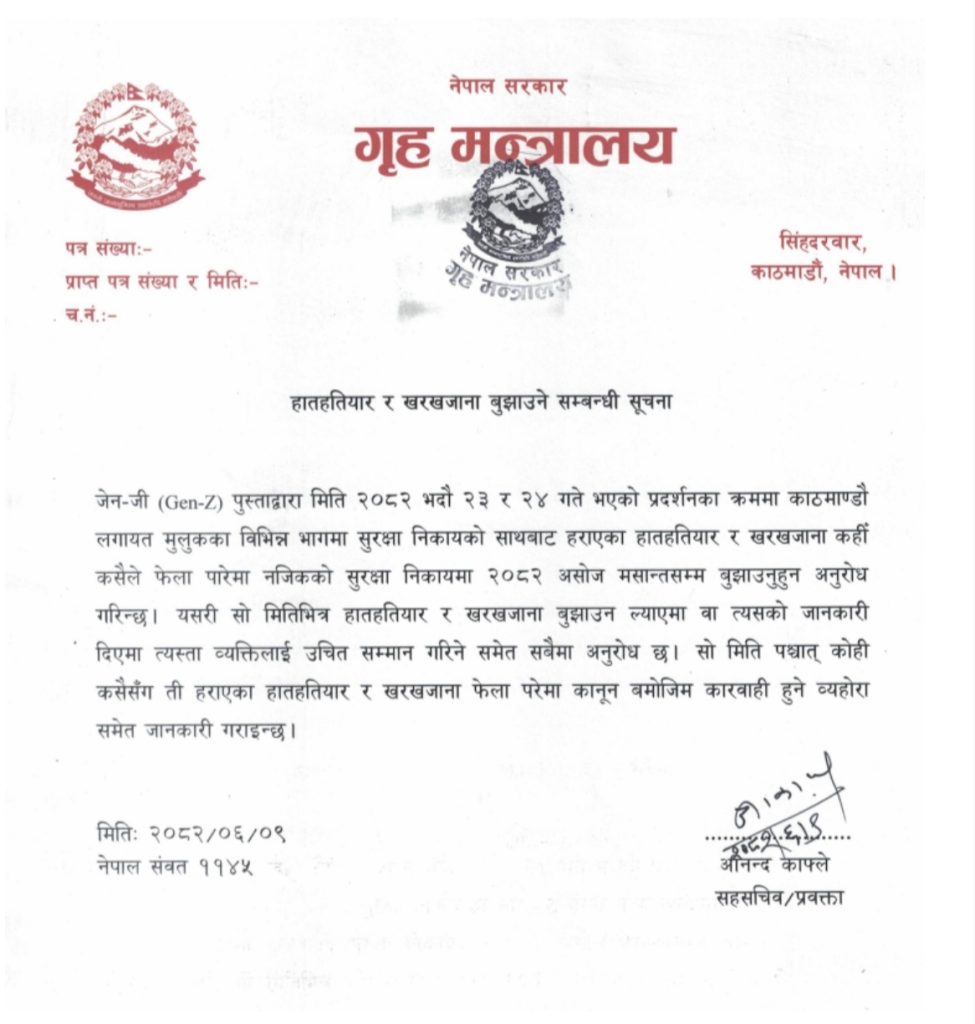 काठमाडौं । गृह मन्त्रालयले जेनजी आन्दोलनमा प्रहरीबाट चोरी भएका हातहतियार फिर्ता गर्न आह्वान गरेको छ ।मन्त्रालयले बिहीबार सूचना प्रकाशन गरी हतियार फिर्ता गर्न सर्वसाधरणलाई आग्रह गरेको हो ।