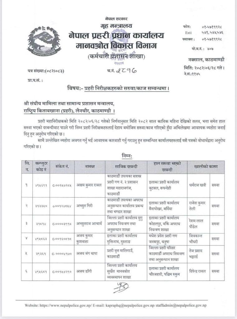 असोज २८ गते प्रहरी महानिरीक्षकको निर्णय अनुसार कात्तिक महिनादेखिको तलव भत्त समेत सरुवा भएको दरबन्दीबाट पाउने सूचनामा उल्लेख छ ।