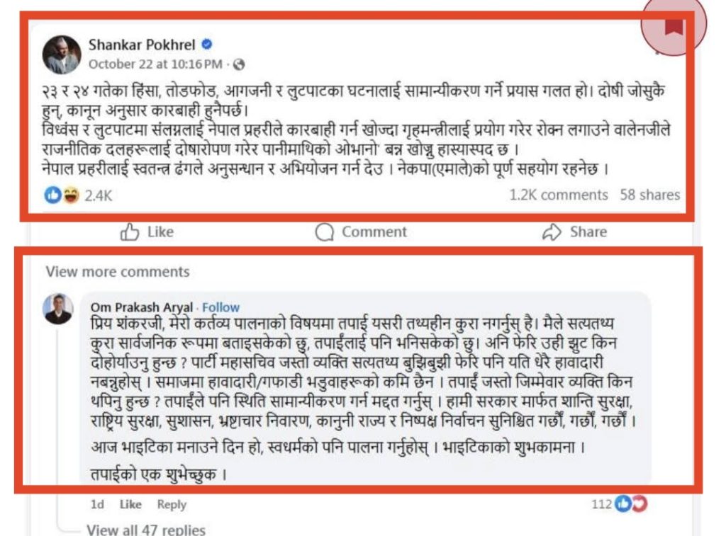 काठमाडौँ । नेकपा (एमाले)का महासचिव शंकर पोखरेल र गृहमन्त्री ओम प्रकाश अर्यालबिच सामाजिक सञ्जाल फेसबुकमा चर्काचर्की परेको छ ।