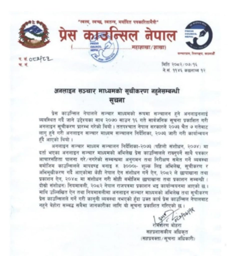 तर हाल छापाखाना तथा प्रकाशन सम्बन्धी (दोस्रो संशोधन) नियमावली, २०८२ कार्यान्वयनमा आएपछि उक्त नियमावलीले अनलाइन सञ्चार माध्यमको अभिलेख तथा सूचीकरण सम्बन्धी अधिकार प्रेस काउन्सिललाई नदिएको काउन्सिलले स्पष्ट पारेको छ।