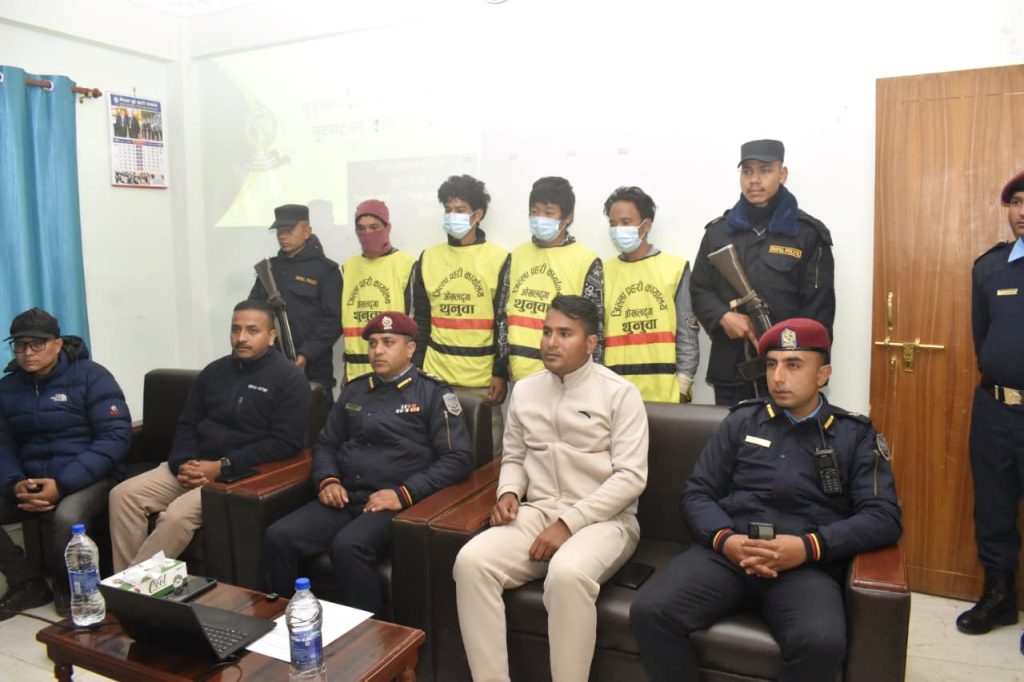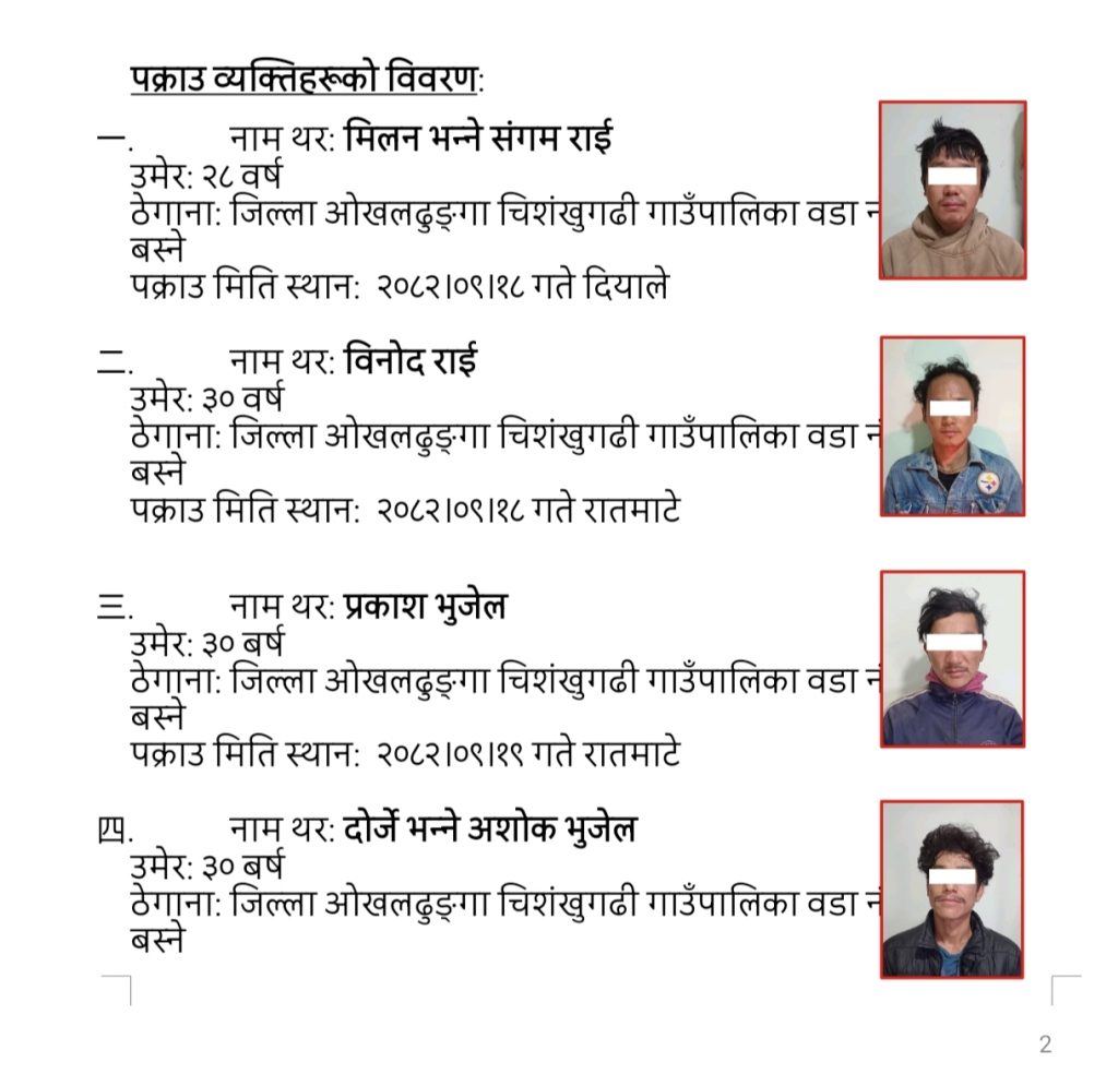 पक्राउ पर्नेमा ओखलढुंगा चिसाङ्ग गाउँपालिका-३ दियाले बस्ने २८ वर्षीय मिलन भन्ने संगम राई, सोही गाउँपालिका-४ का ३० वर्षीय विनोद राई, ३० वर्षीय प्रकाश भुजेल र वडा नम्बर ८ बस्ने ३० वर्षीय दोर्जे भन्ने अशोक भुजेल रहेका छन् । विनोद राईलाई शुक्रबार दियालेबाट पक्राउ गरिएको हो भने बाँकी ३ जनालाई हिजो रातमाटेबाट पक्राउ गरेको हो ।