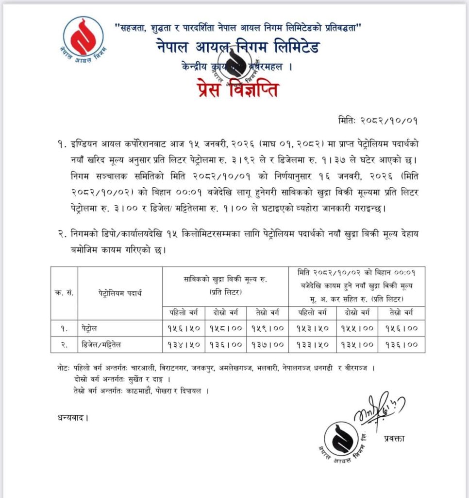 इन्डियन आयल कर्पोरेसनबाट माघ १ मा प्राप्त पेट्रोलियम पदार्थको नयाँ खरिद मूल्यअनुसार निगम सञ्चालक समितिले नयाँ मूल्यसूची निर्धारण गरेको हो ।