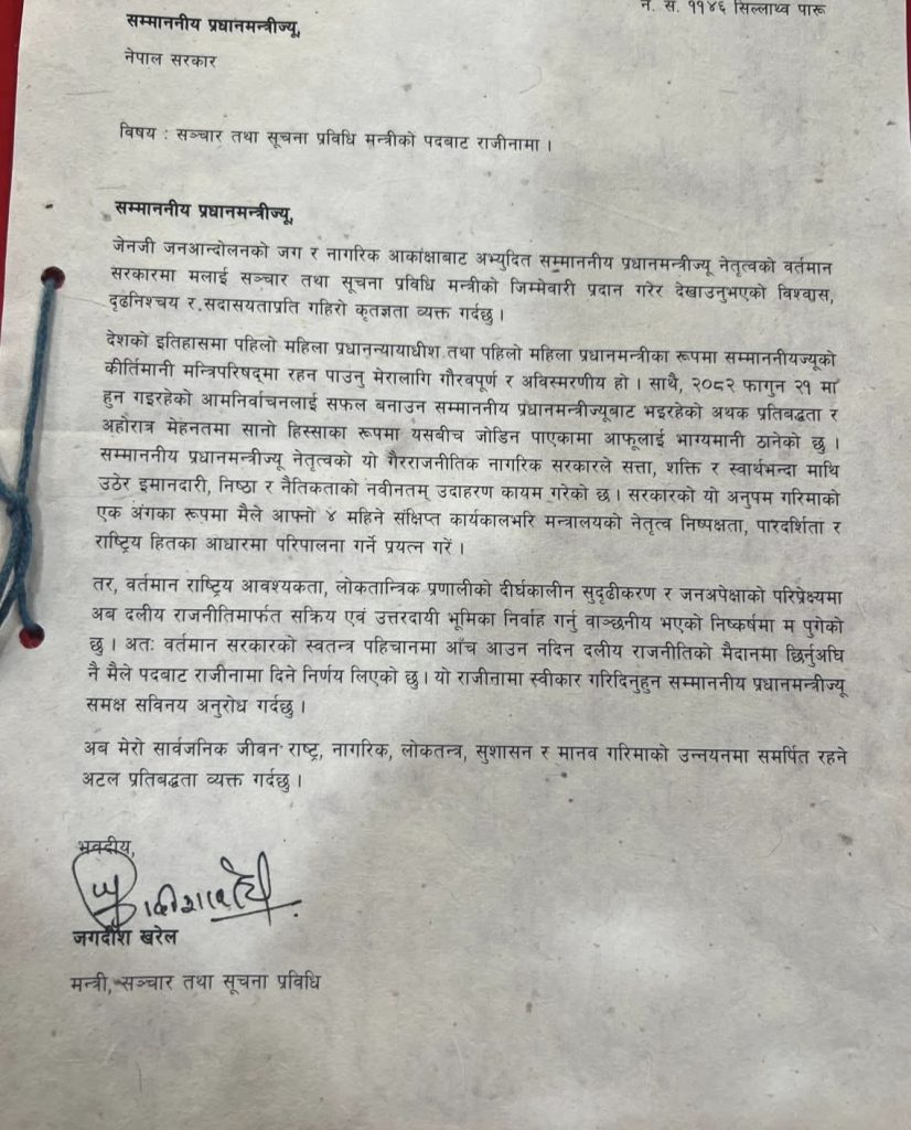 काठमाडौं । राष्ट्रिय स्वन्तत्र पार्टी (रास्वपा)बाट उम्मेदवार बन्ने पक्का भएसँगै उनले आज प्रधानमन्त्री सुशीला कार्की समक्ष राजीनामा बुझाएका हुन्।