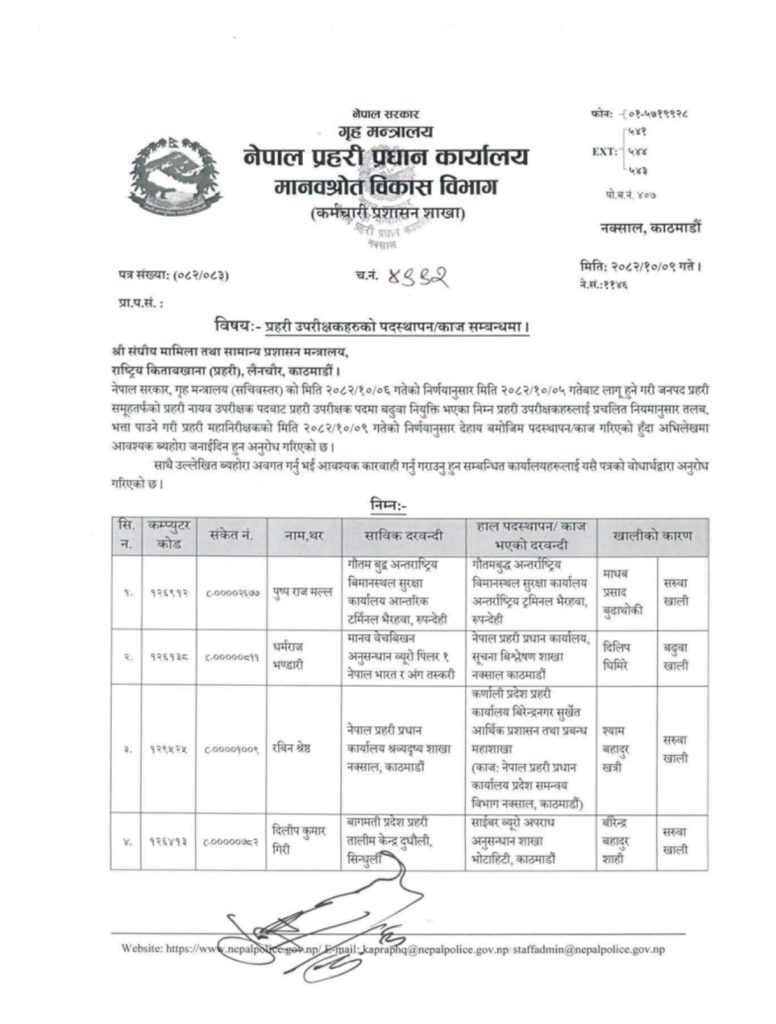काठमाडौं । गृहमन्त्रालयको सचिव स्तरीय निर्णय अनुसार ५ माघदेखि लागु हुने गरी जनपद प्रहरी समूह तर्फको प्रहरी नायव उपरीक्षक पदबाट प्रहरी उपरीक्षक पदमा बढुवा नियुक्ति भएका एसपीहरूको पदस्थापना गरिएको हो ।