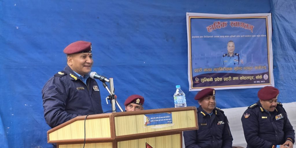 बाँके । लुम्बिनी प्रदेश प्रहरी प्रमुख प्रहरी नायव महानिरीक्षक डिआईजी भूपेन्द्र बहादुर खत्रीद्वारा लुम्बिनी प्रदेश प्रहरी गण खजुरा बाँकेको अनुगमन गर्नुभई निर्वाचन सुरक्षा, अपराध नियन्त्रण, शान्ति–सुरक्षाकायम, ट्राफिक व्यवस्थापन, लागुऔषध नियन्त्रण, सिमा अपराध नियन्त्रण, महिला, बालबालिका,जेष्ठ नागरिकको संरक्षण तथा विपद् व्यवस्थापन लगायतका समसामयीक विषयमा आवश्यक निर्देशन सम्बोधन गर्नु भएको लुम्बिनी प्रदेश प्रहरी कार्यालय तुल्सीपुर दाङले जानकारी दिएको छ ।