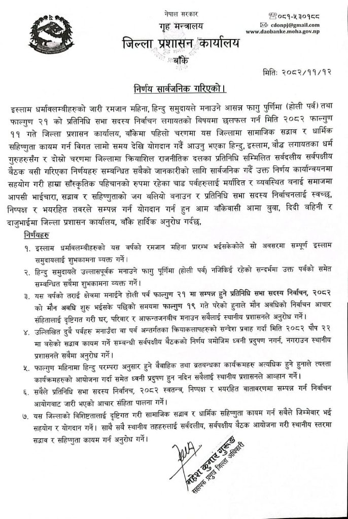 बाँके । जिल्ला प्रशासन कार्यालय बाँकेले आसन्न फागु पूर्णिमा (होली) पर्व, रमजान महिना तथा प्रतिनिधि सभा सदस्य निर्वाचन २०८२ लाई लक्षित गर्दै सामाजिक सद्भाव र धार्मिक सहिष्णुता कायम राख्न ७ बुँदे निर्णय सार्वजनिक गरेको छ।