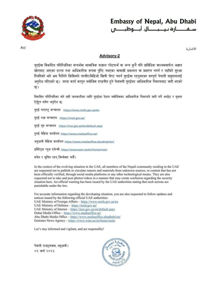 काठमाडौं । युएई दूताबासले अपील प्रकाशन गर्दै अहिले युएईमा विकसित भइरहेको परिस्थितिका सन्दर्भमा सामाजिक सञ्जाल प्लेटफर्म वा अन्य कुनै पनि प्राविधिक माध्यममार्फत अज्ञात स्रोतबाट आएका हल्ला तथा आधिकारिक रूपमा पुष्टि नभएका सामग्री प्रकाशन वा प्रसारण नगर्न र सुरक्षा स्थितिबारे भ्रम फैलिने मनसायको सन्देश प्रवाह नगर्न आग्रह गरेको हो ।