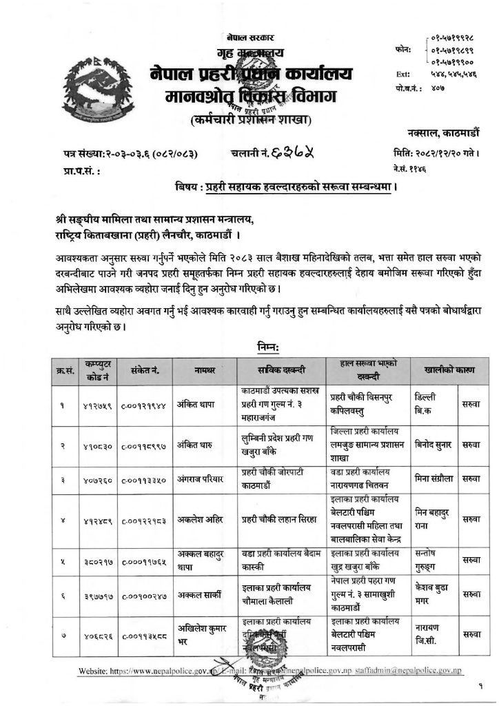 अंकित थापालाई प्रहरी चौकी विसनपुर,कपिलवस्तु सरुवा गरिएको छ । त्यस्तै अंकित थारुलाई जिल्ला प्रहरी कार्यालय लमजुङ सामान्य प्रशासन शाखामा सरुवा गरिएको छ । अंगराज परियारलाई वडा प्रहरी कार्यालय नारायणगढ चितवन सरुवा गरिएको छ ।