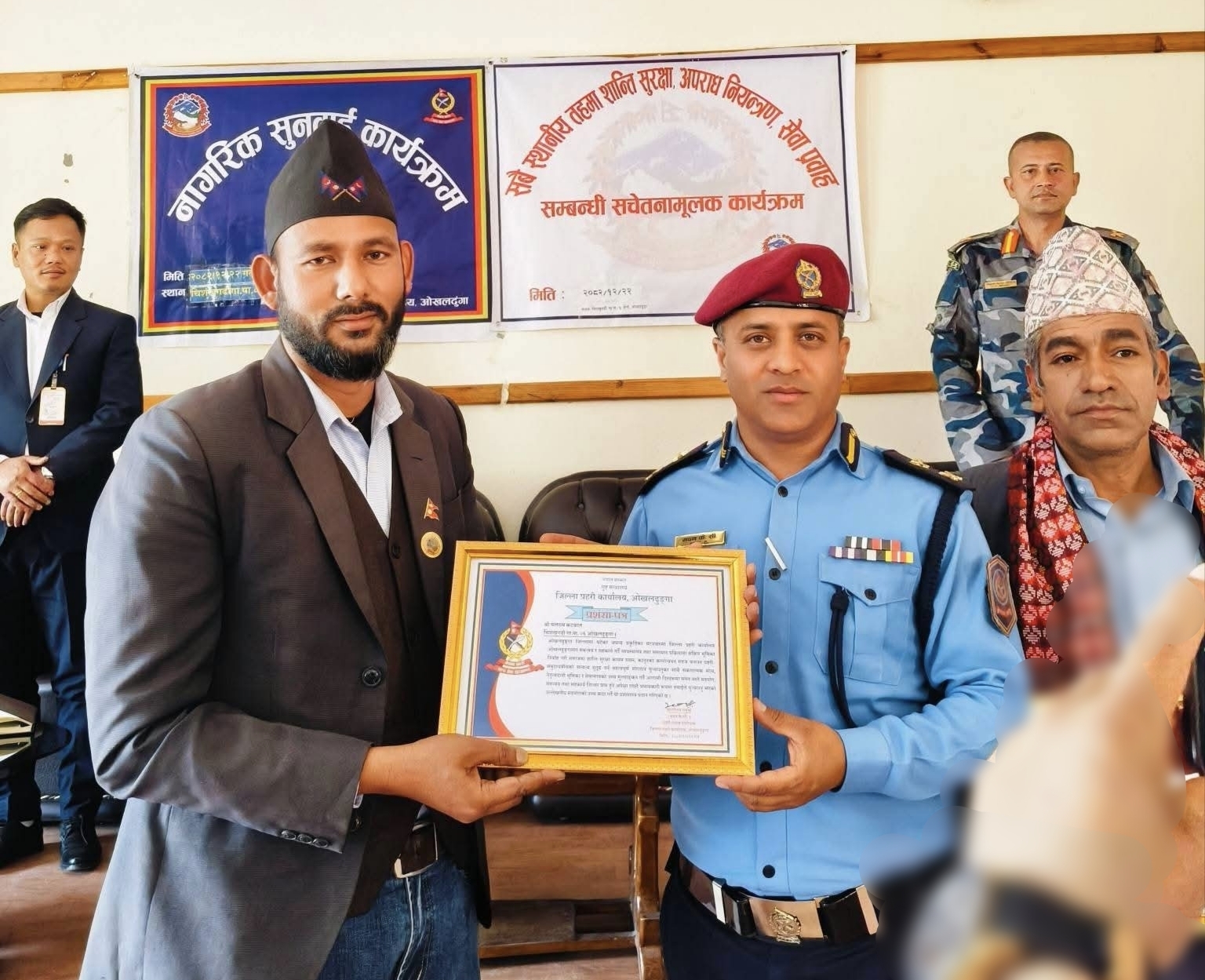 यसका साथै जिल्ला प्रहरी कार्यलयलाई जघन्य प्रकृतीका घटनाहरुमा सफल अनुसन्धान गर्न सहयोग गर्नु हुने चिशंखुगढी गा.पा.वडा नं. ०६ र वडा नं. ०८ का अध्यक्षहरुलाई प्रहरी प्रमुख मदन के.सीद्वारा प्रशंसा पत्र समेत वितरण गर्नुभएको छ ।