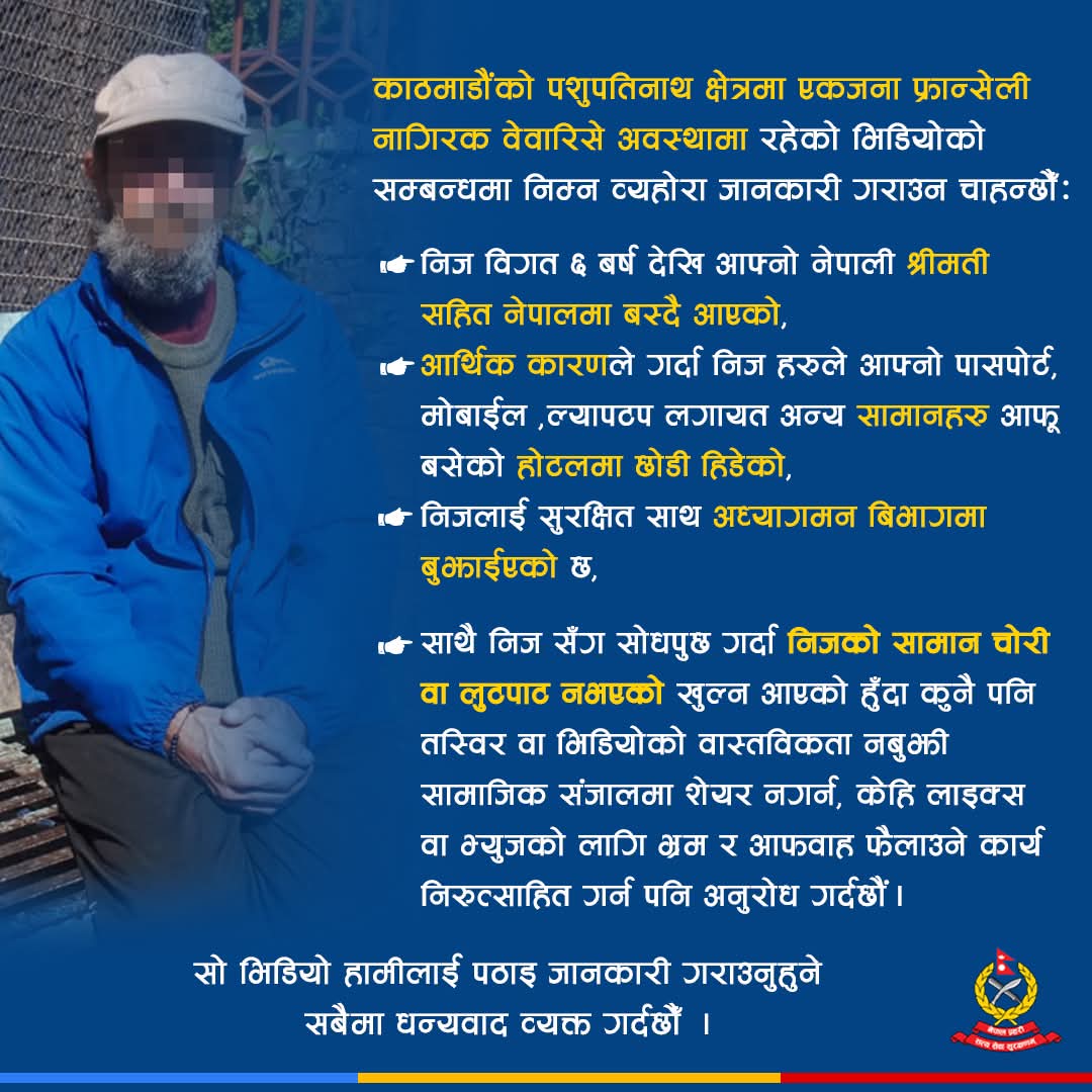 काठमाडौं । पशुपतिनाथ मन्दिर क्षेत्रमा एक फ्रान्सेली नागरिक भिक्षा मागिरहेको भिडियो सामाजिक सञ्जालमा भाइरल भएपछि उक्त घ’टनाबारे प्रहरीले वास्तविकता सार्वजनिक गरेको छ।भाइरल भिडियोमा ती विदेशी नागरिक नेपाल भ्रमणका क्रममा लु’टिएपछि भिक्षा माग्न बाध्य भएको दाबी गरिएको थियो। तर प्रहरीका अनुसार उक्त विवरण पूर्ण रूपमा सत्य नभएको स्पष्ट भएको छ।प्रहरीले जनाएको अनुसार ४८ वर्षीय ती फ्रान्सेली नागरिक विगत करिब ६ वर्षदेखि नेपालमै बसोबास गर्दै आएका छन् र उनकी श्रीमती नेपाली नागरिक हुन्।सामाजिक सञ्जालमा फैलिएको जस्तो उनका मोबाइल, ट्राभल डकुमेन्ट र ल्यापटप लु’टिएको नभई, चाबहिलस्थित एक होटलमा बस्दा बिल तिर्न नसक्दा ती सामान कोठामै छोडिएको पाइएको प्रहरीले जनाएको छ। उनी “पैसा ल्याउँछु” भन्दै केही समयका लागि बाहिर निस्किएका थिए।