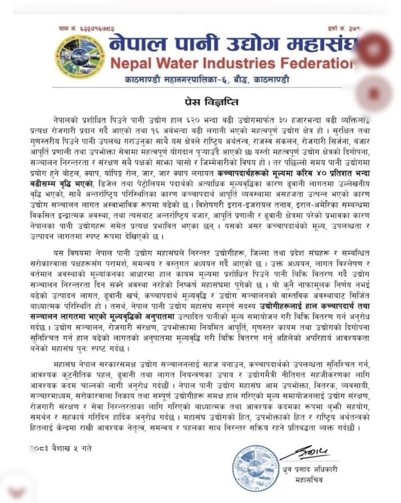 विज्ञप्तिमा भनिएको छ, ‘यो कुनै नाफामूलक निर्णय नभई बढेको उत्पादन लागत, ढुवानी खर्च र कच्चा पदार्थको मूल्यवृद्धिका कारण सिर्जित बाध्यात्मक परिस्थिति हो । उद्योगको दिगोपन, गुणस्तर कायम र नियमित आपूर्तिका लागि लागतको अनुपातमा मूल्य समायोजन गर्नु अहिलेको अपरिहार्य आवश्यकता बनेको छ ।’