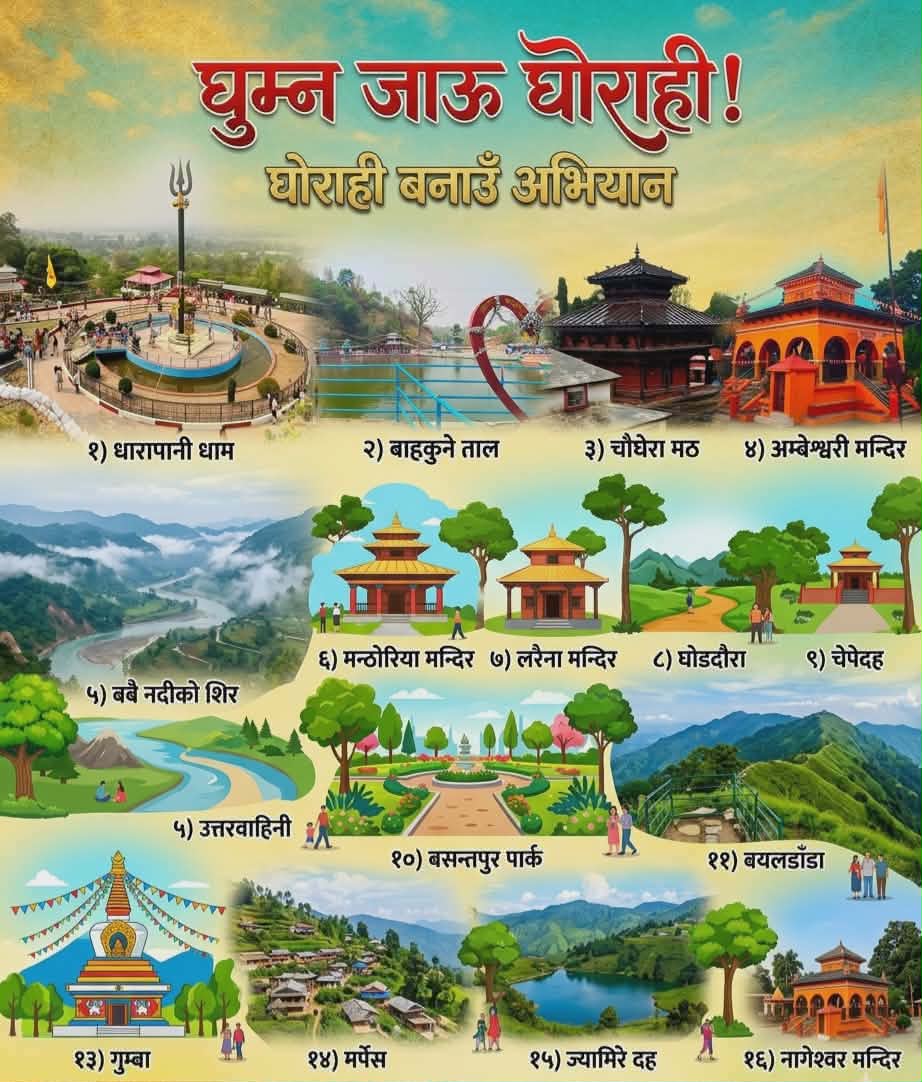 दाङ । घोराही बनाउँ अभियानले सार्वजनिक गरेको घुम्न जाउँ घोराही पोस्टर भाइरल भएको छ। सयौं व्यक्तिहरूले पोस्टर आफ्नो फेसबुक वालमा सेयर गर्नुका साथै सकारात्मक कमेन्ट समेत गरेका छन्। यो पोस्टर एआईको माध्यमबाट घोराही बनाउँ अभियानका संयोजक सबिन प्रियासनले बनाउनुभएको हो । यो पोस्टर विभिन्न सञ्चार माध्यमहरुले समेत समाचार बनाएर यतिबेला छापिरहेको छन्। पोस्टरमा धेरैका मुख्यमुख्य धार्मिक एवं प्राकृतिक पर्यटकीय क्षेत्रहरूको तस्बिर नाम उल्लेख गरिएको छ। घोराही बनाउँ अभियानका संयोजक सबिन प्रियासनले सबै ठाउँका बास्तबिक फोटो, नाम, ठेगाना सहित घुम्न जाऊ घोराही अभियान कार्यक्रम सुरु गरिने बताउनुभयो । यस्तो पोस्टर विभिन्न चोक वडा होटलहरु, बस अनि अटोहरुमा समेत टाँसिने प्रियासनको भनाइ छ।
