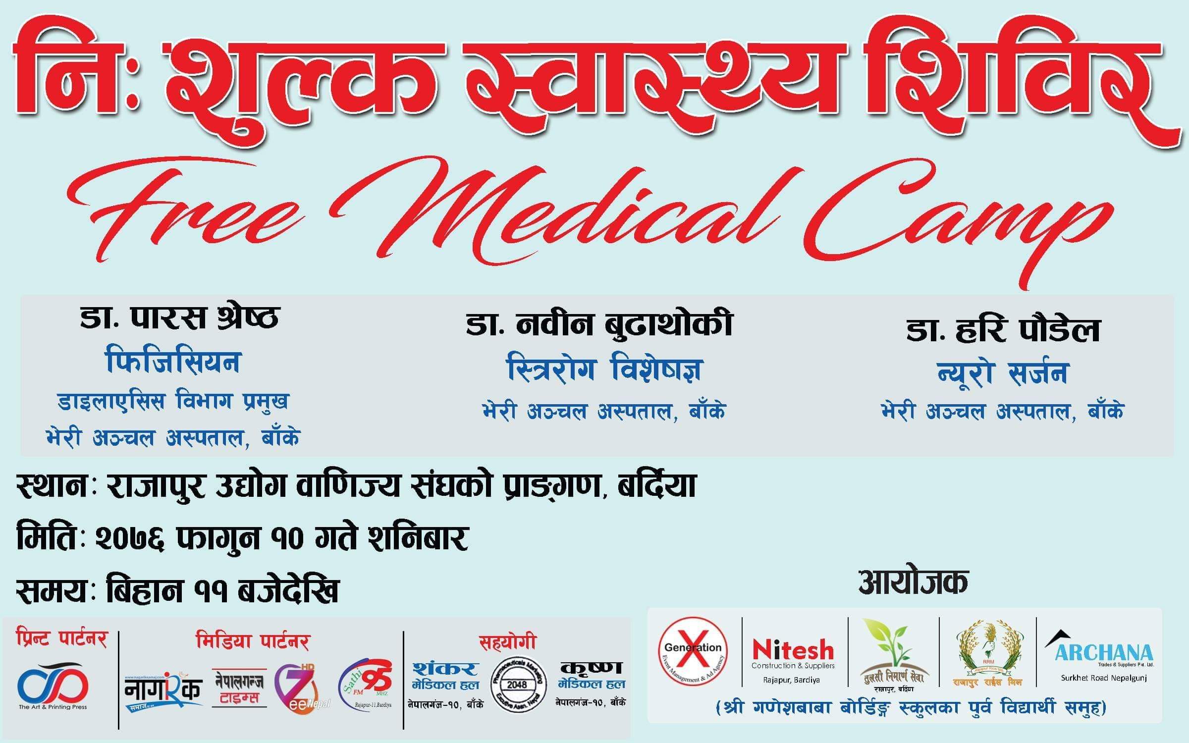 राजापुर वासीहरुलाई स्वास्थ्य सम्बन्धि जानकारी दिने र भेरी अंचल अस्पतालका दक्ष चिकित्सकहरु द्वारा स्वास्थ्य जाँच गराउने उद्देश्य आयोजना गरिएको शिविर राजापुर उद्योग वाणिज्य संघ बर्दियाको प्राङ्गणमा हुनेछ। उक्त शिविर मा डा.पारस श्रेष्ठ (फिजिसियन) डा. नवीन बुढाथोकी (स्त्रीरोग बिशेषज्ञ) डा. हरी पौडेल (न्युरो सर्जन) को टिम आउने छ। यो शिविर पुर्ण रुपमा निःशुुल्क हुनेछ । चेकजाच र अौषधी निःशुुल्क हुने शाह ले जानकारी गराउनु भयो ।