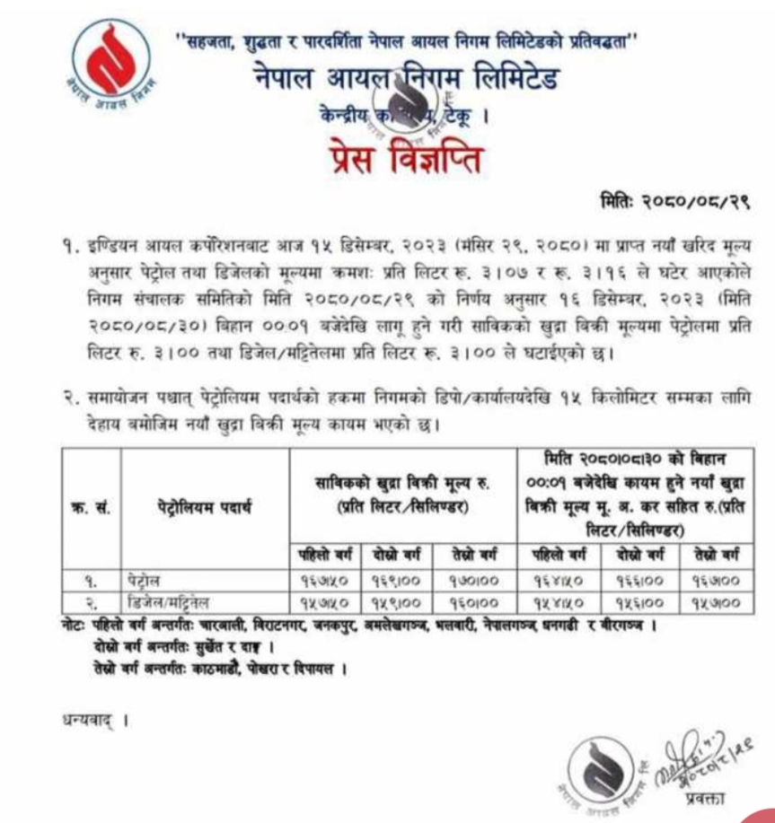 (एबिसि संचार ) नेपाल आयल निगमले पेट्रोल, डिजेल र मट्टितेलको भाउ प्रतिलिटर ३ रुपैयाँ घटाएको छ । मंसिर ३० गते बिहान ००.०१ बजेदेखि लागू हुने […]